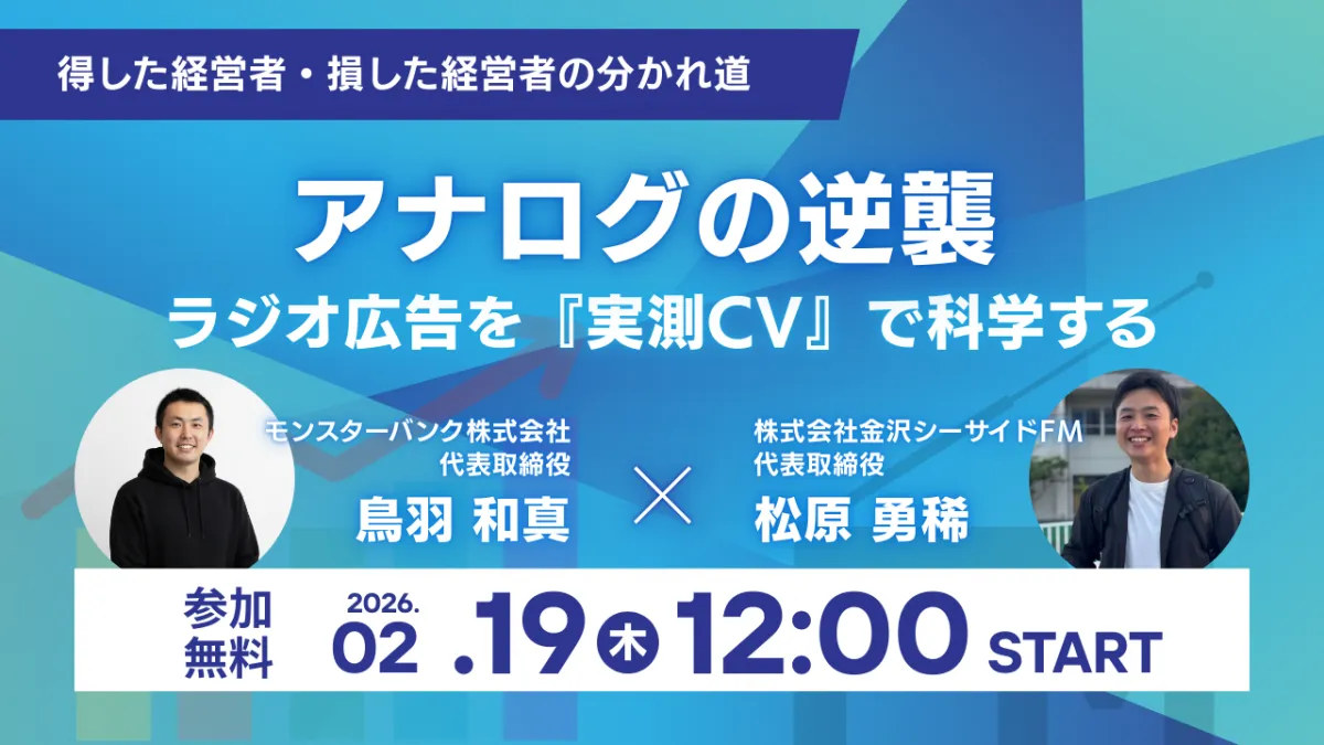 2026年2月19日(木)、モンスターバンク株式会社と金沢シーサイドFMが共催するウェビナーは、アナログメディアにおける投資対効果(ROI)の可視化をテーマとしています。多くの経営者から寄せられる懸念、「広告を流しても効果が見えない」という点に真正面から取り組みます。このウェビナーを通じて、アナログメディアの持つ可能性と実績に基づくデータを提示し、「ラジオ広告に対する先入観を覆す」ことを目指します。