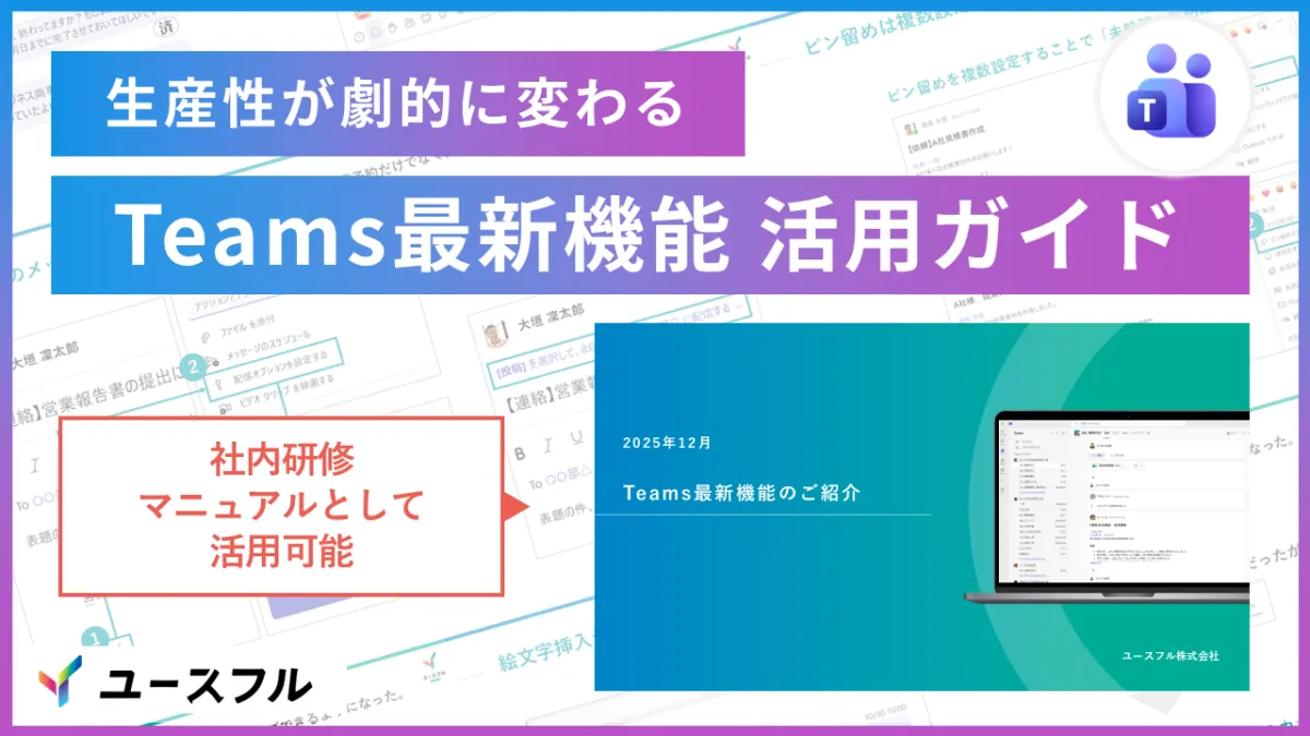 ユースフル株式会社は2023年12月18日より、Microsoft Teamsの便利機能をまとめたホワイトペーパー『Teams最新機能ガイド 2025年12月版』を公式サイトで無料公開しました。これは、業務スピードを大幅に向上させるために設計された実用的な資料です。多くのビジネスパーソンが抱える「使いこなせる機能が増えたのに、どうしても非効率な作業をしてしまう」という悩みに対する解決策を提供します。