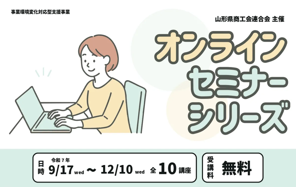 山形県商工会連合会は、事業者が直面する課題を支援する「令和7年度オンラインセミナーシリーズ」を開催します。自社のビジネス環境が変化する中、必要な知識やスキルを身につけたい方に向けたこのセミナーが、9月17日から12月10日までの間に無料で実施されます。