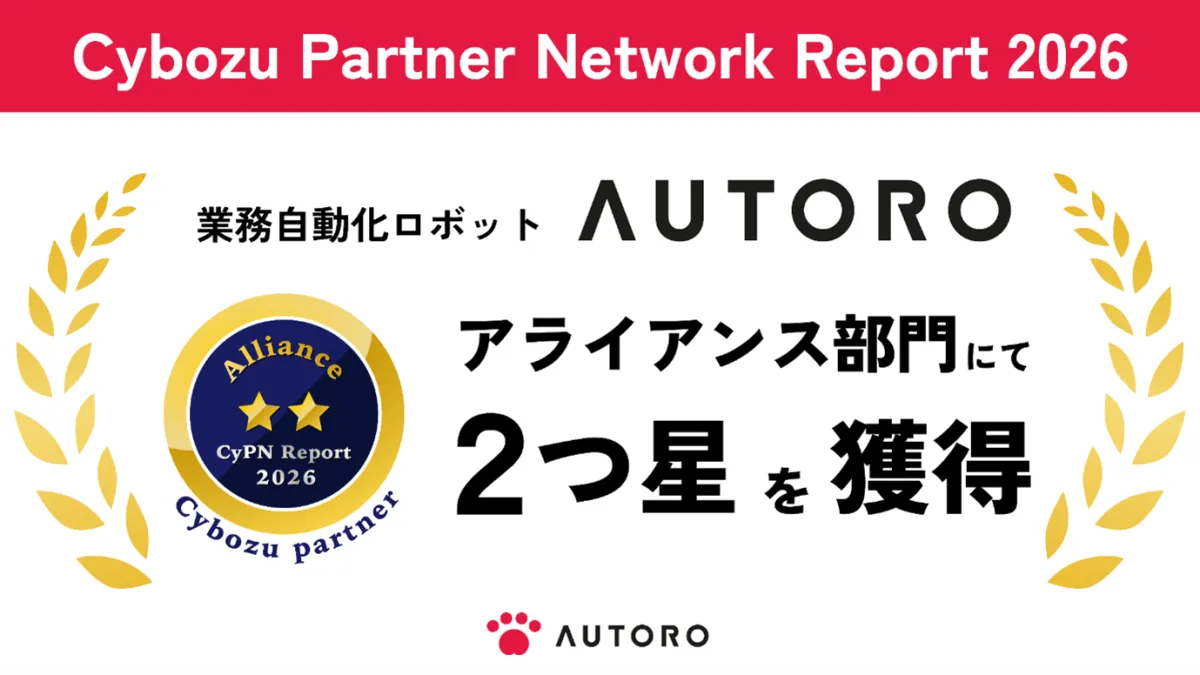 オートロ株式会社(以下、AUTORO)は、サイボウズ株式会社が提供する「Cybozu Partner Network Report 2026」において、アライアンス部門で2つ星の評価を受けました。これはAUTOROの業務自動化ロボットが高く評価された証です。