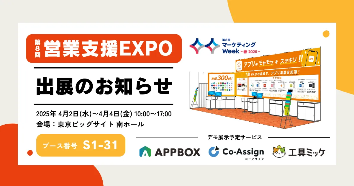 ブースでは、実際に「APPBOX」を体験できるデモアプリや管理画面の体験コーナーも設けています。また、開発リソースの最適化を実現する「Co-Assign」や、工事現場での工具管理を効率化する「工具ミッケ」についてもデモ体験を提供。これにより、マーケティング施策を支援する手軽さと使いやすさを体感できる機会となります。