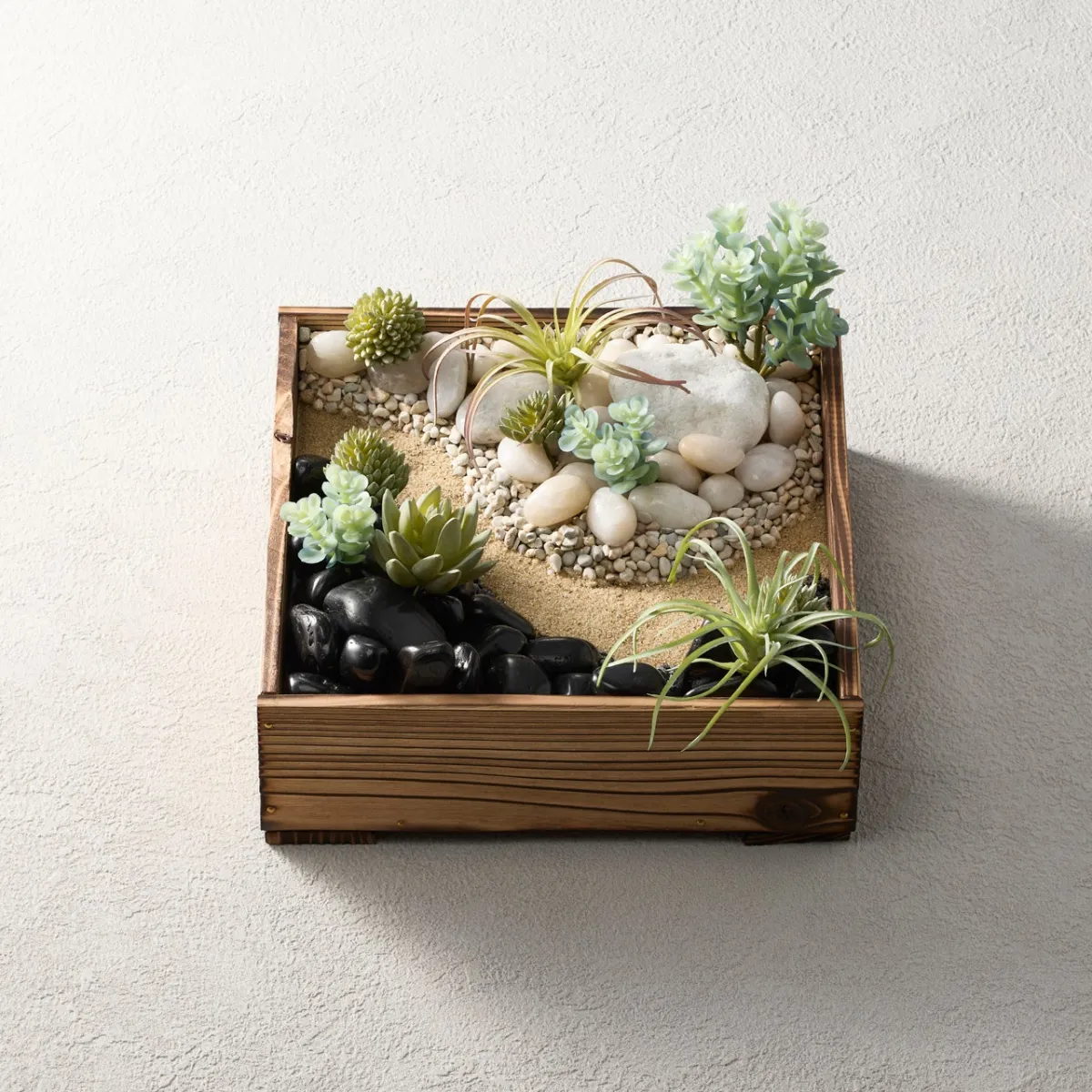 この箱庭は、自然界に存在する陰と陽のコントラストを巧みに利用しており、白と黒の石で形作られたクリエイティブな景観が特徴です。さらに人工の多肉植物が添えられ、静かな中にも生命の息吹を感じさせる美しい風景が広がります。川辺を連想させるこのデザインは、見る者に安らぎを与え、様々な居住空間に調和します。和室や洋室はもちろん、オフィスのディスプレイにも最適で、大切な人へのギフトにもぴったりです。