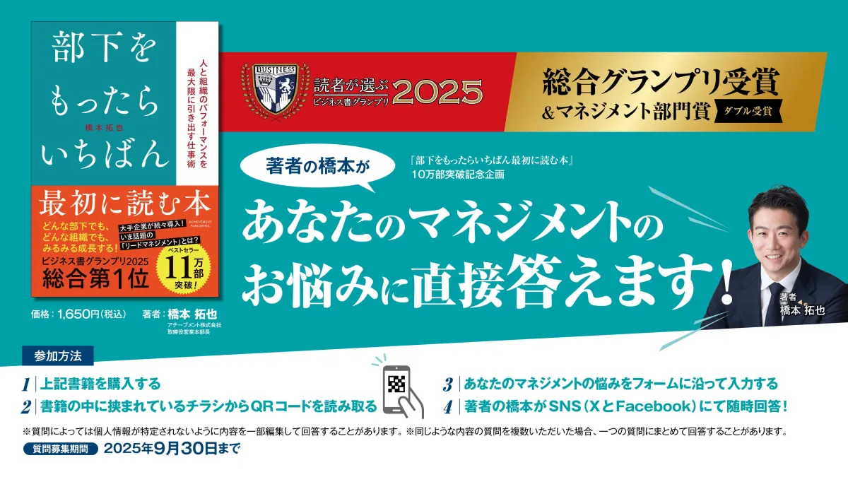 著者の橋本拓也による『部下をもったらいちばん最初に読む本』が、発売から約1年で驚異の11万部を達成しました!この成功を記念して、著者が読者のマネジメントに関する悩みにSNSで直接回答する特別企画を始めることが発表されました。この本は、初めて部下を持つ管理職や、チームのパフォーマンスを向上させたい全ての人に参考になる内容です。