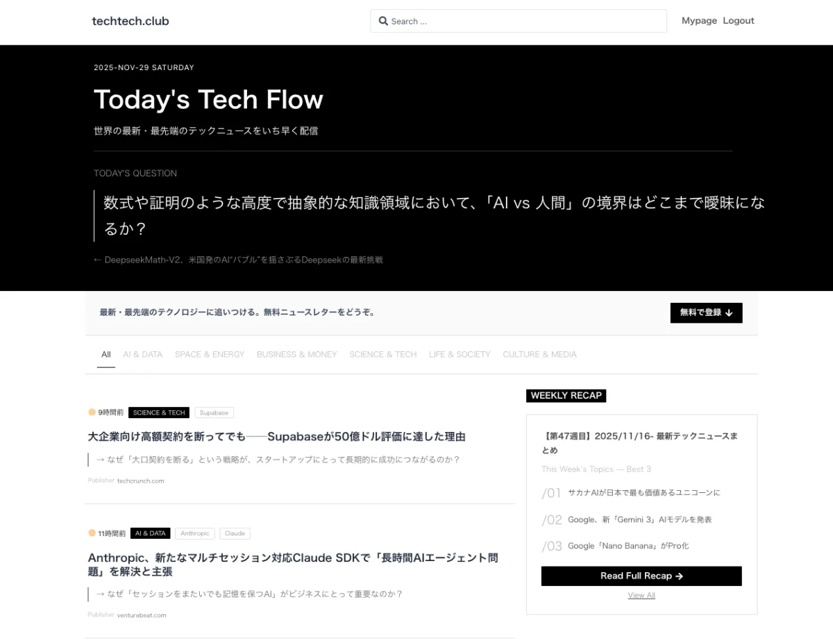 techtech.clubで扱うニュースは、信頼性と重要性に特化した内容を厳選することが大切です。AI、宇宙、ビジネス、エネルギー、ライフスタイルなど、テクノロジーに関する最前線の話題を中心に配信します。無駄な情報を取り除き、読者が「今押さえるべきニュース」だけを受け取れるようにしています。日々変化するテクノロジーの流れを把握するための高精度な情報収集が可能になります。