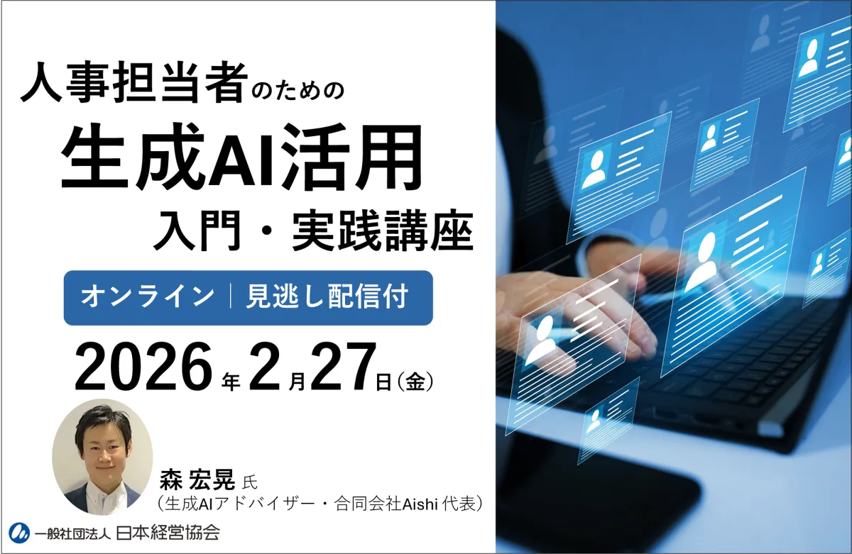 一般社団法人日本経営協会が2026年2月27日(金)に、人事担当者向けに特化したオンラインセミナーを開催します。その名も「人事担当者のための生成AI活用入門・実践講座」。このセミナーは、自社の人事業務に生成AIをどのように取り入れ、レスポンスを上げるかを具体的に探る内容です。