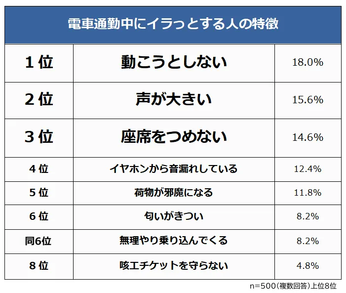 調査の結果、電車通勤中にイラッとする人の特徴として最も多かったのは「動こうとしない」とされ、さらに「声が大きい」や「座席をつめない」といった行動が続きました。これらの行動は、自他ともに快適な通勤を阻害する要因となり、特に混雑した電車では深刻な問題です。