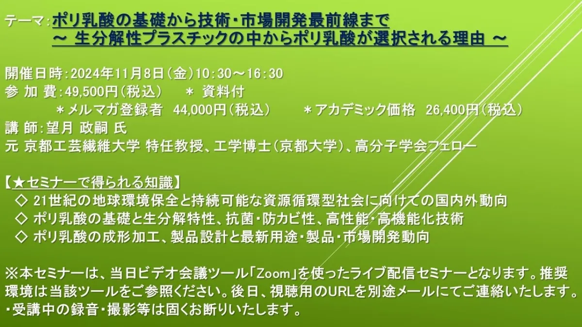本セミナーでは、元京都工芸繊維大学の特任教授で工学博士の望月政嗣氏を講師に迎え、「ポリ乳酸の基礎から技術・市場開発最前線まで」というテーマで進行されます。セミナーは、ポリ乳酸が選ばれる理由やその技術、国内外の動向について深堀りします。