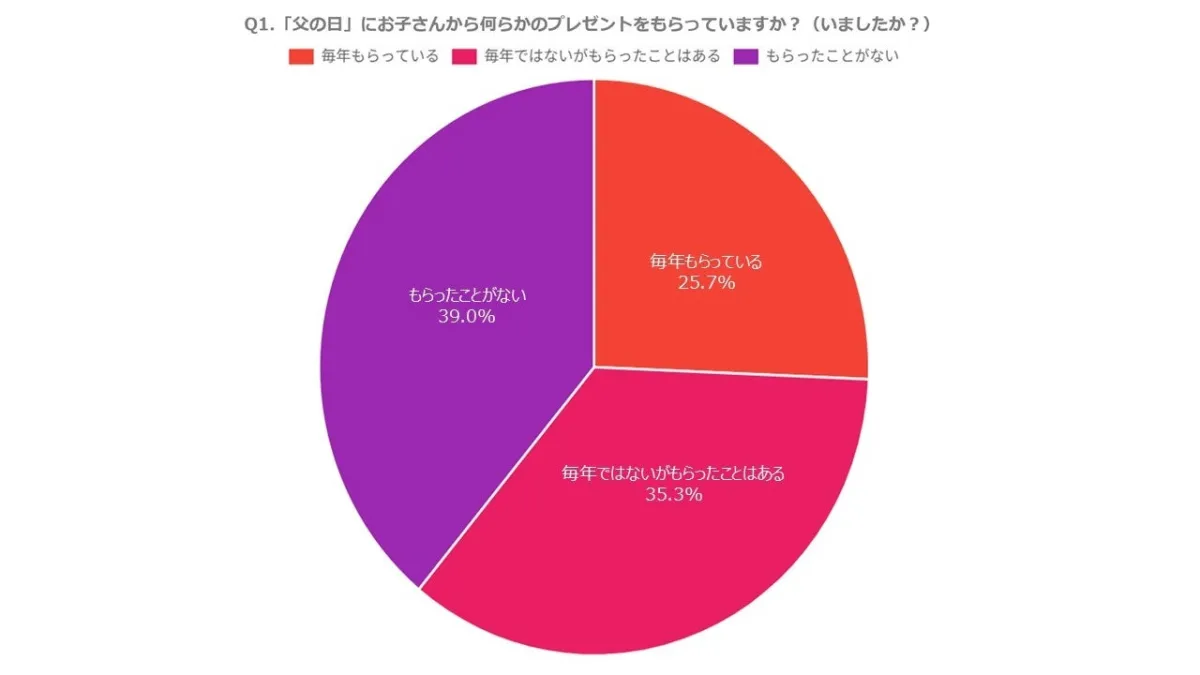 調査の結果、61.0%のお父さんが「父の日に何らかのプレゼントをもらったことがある」と回答しました。さらに60.7%は「もらったら嬉しい」と肯定的ですが、一方で「特に気にしない」との意見もあり、約4割が父の日を特別な日ではないと感じている実態が浮かび上がりました。
