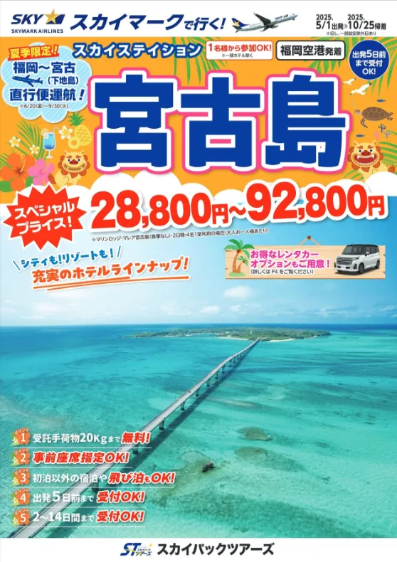 福岡空港から直行便で宮古島へ行く「スカイステーション宮古島」が、スカイパックツアーズ株式会社の新作旅行商品として登場しました。この商品は2025年の5月1日から10月25日までの期間限定で提供され、価格は驚きの28,800円から。夏のシーズンには、下地島空港への直行便が運航され、利便性がより高まります。