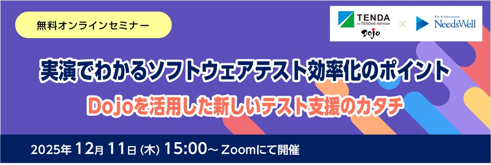 2025年12月11日(木)15時から、株式会社ニーズウェルが主催する無料オンラインセミナー、「実演でわかるソフトウェアテスト効率化のポイント」が開催されます。このセミナーでは、デモを交えながら、ソフトウェアテストの効率化に向けた具体的な手法とその重要性について解説するとともに、最新のテスト支援サービス「Dojo」の活用方法にも触れます。