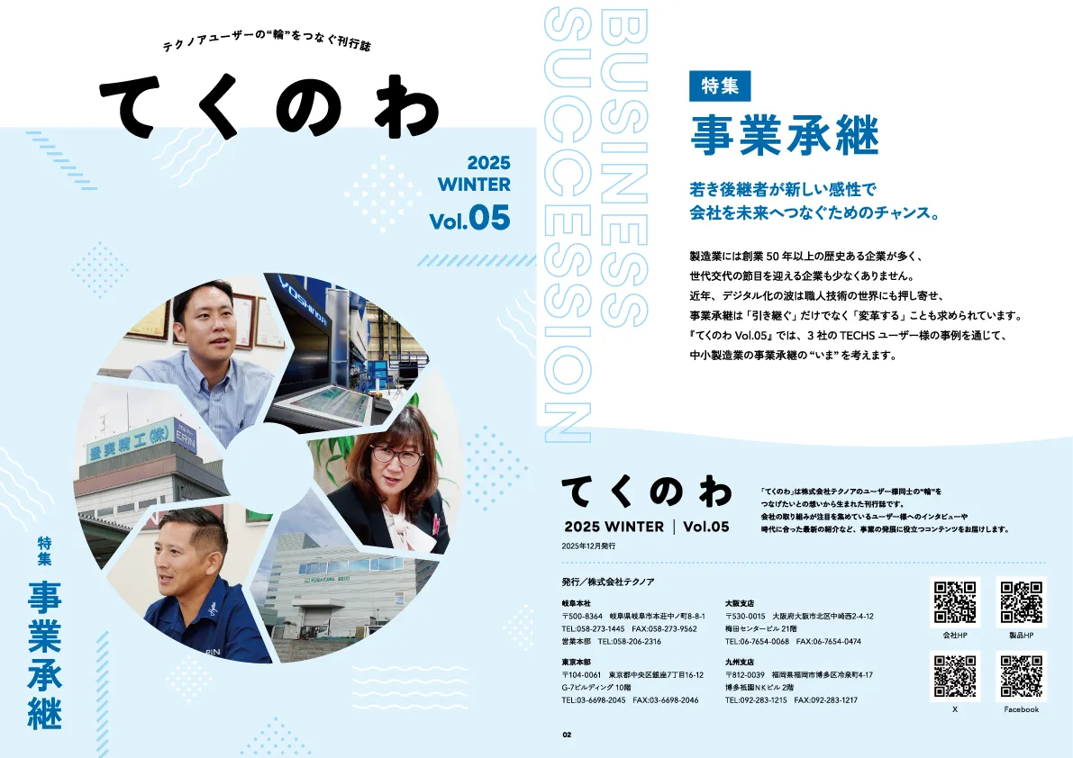 株式会社テクノア(岐阜県岐阜市、本社所在地)の代表取締役である山﨑耕治氏が、2025年12月15日に刊行誌『てくのわ』Vol.5を発行いたしました。『てくのわ』は、テクノアユーザーであるものづくり企業同士をつなぐことを目的としており、年に2回刊行しています。これまでの発行では、様々な企業の先進的な取り組みを紹介し、多くの方々から高い評価を受けてきました。