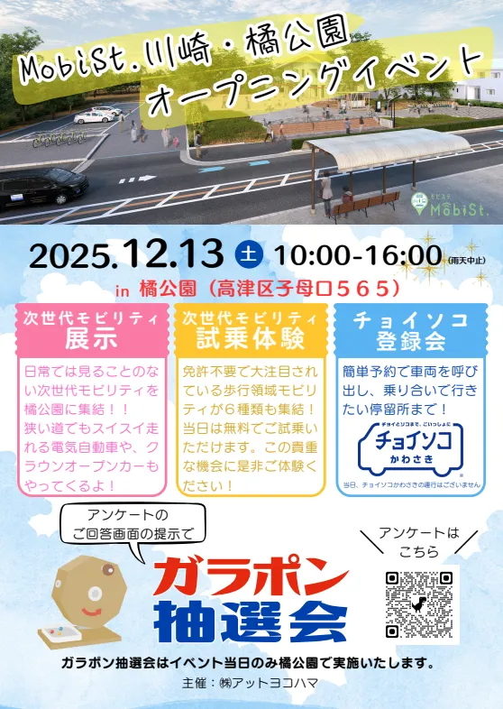 2025年12月13日、川崎市の橘公園にて、次世代モビリティをテーマにした特別なオープニングイベントが開催されます。このイベントは「MobiSt. 川崎・橘公園」として知られており、川崎市と株式会社アットヨコハマが共同で進める社会実験プロジェクトの一環です。
