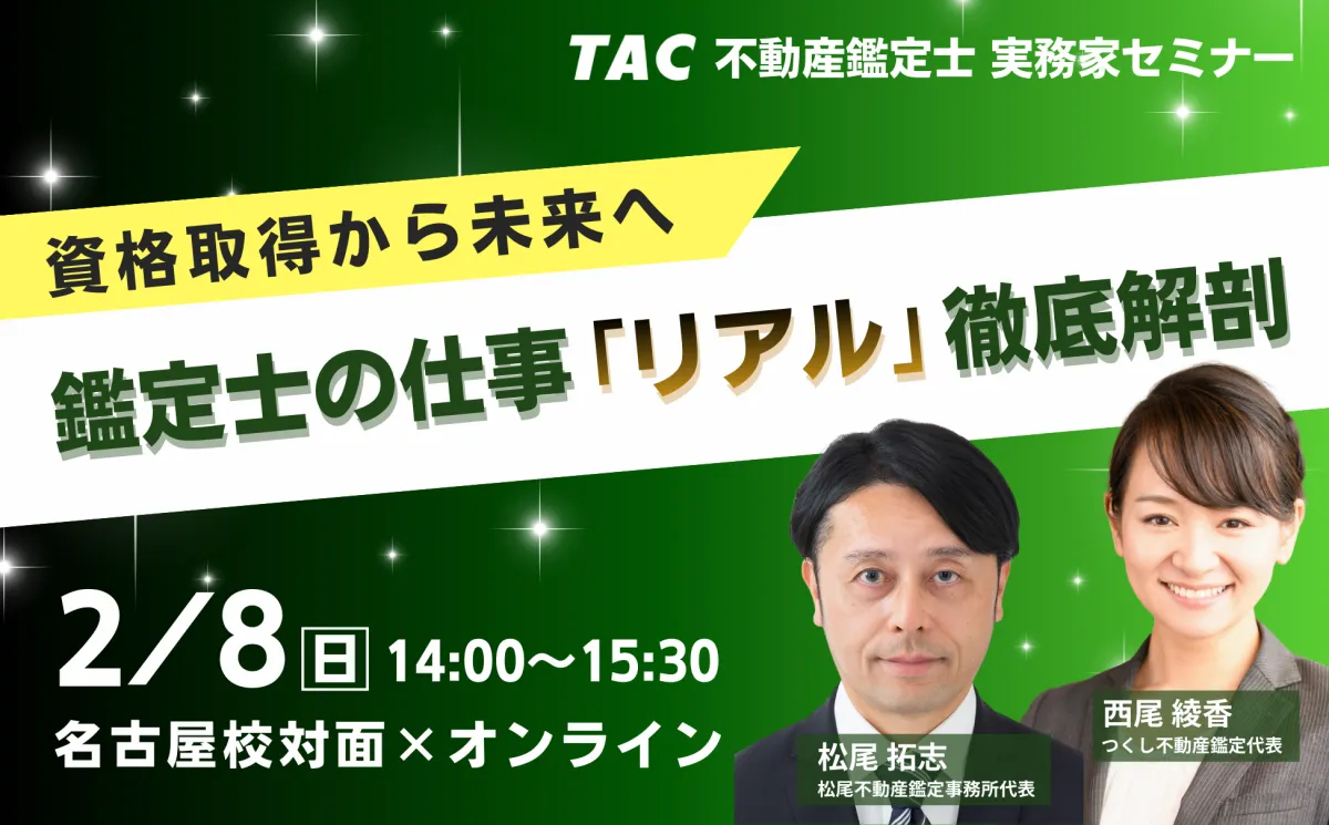 2026年2月8日(日)、TAC株式会社が主催する不動産鑑定士実務家セミナーが名古屋からオンラインで開催されます。このイベントは、資格を取得した後、どのように不動産鑑定士としてのキャリアを築くのか、またその業務内容について深く探求する機会です。