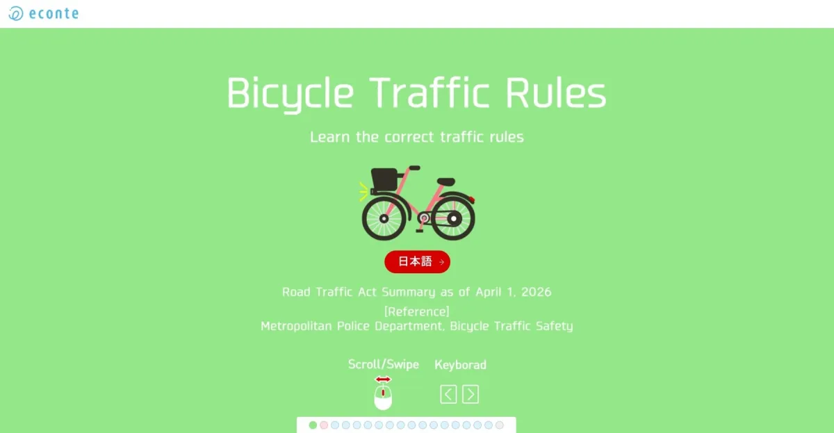 株式会社エコンテは、東京都渋谷区に本社を置く企業で、交通安全や社会課題解決に向けたコンテンツを制作しています。今回公開された英語版インフォグラフィックは、警視庁や警察庁からの公式な交通ルールに基づき、2026年より施行される自転車の「交通反則通告制度(青切符)」など、主な交通違反についてもクリアに解説しています。