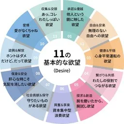 「DESIRE Profiling」は、消費者が潜在的に持つ11種類の欲望に焦点を当て、それを基にした顧客データを分析します。この「11の欲望」は、日常の買い物やサービス利用において、消費者が求める動機を測定するための指標として機能します。