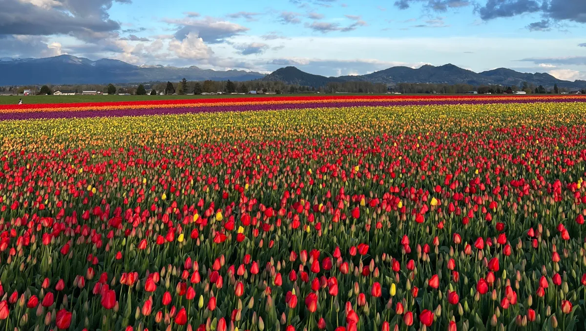 アメリカ、ワシントン州のスカジットバレーでは、毎年この季節になると色とりどりのチューリップが咲き誇り、「スカジットバレー・チューリップ・フェスティバル」が開催されます。この祭典は4月を通じて行われ、マウント・バーノンやラ・コナー周辺が主な舞台です。毎年、世界中からの観光客が訪れ、その美しい光景に魅了されます。