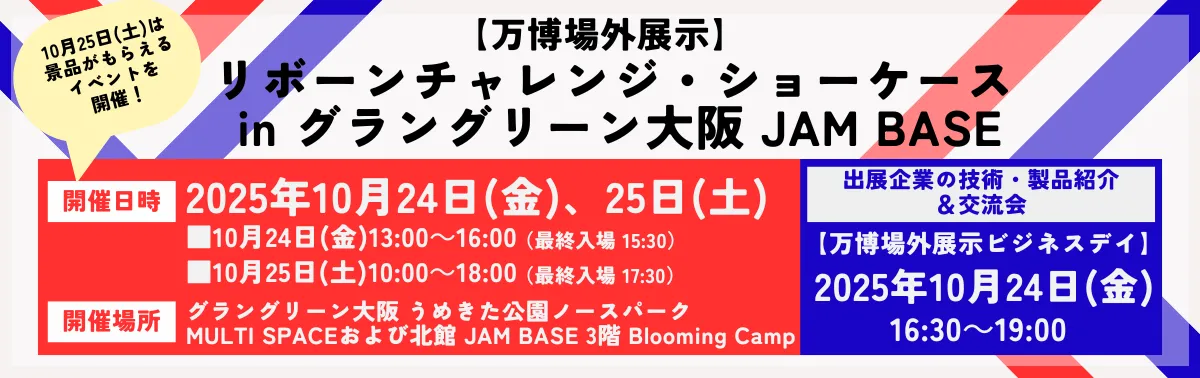 さらに、初日の10月24日には、出展企業と直接交流できる「万博場外展示ビジネスデイ」が16:30から開催され、参加には事前の予約が必要です。