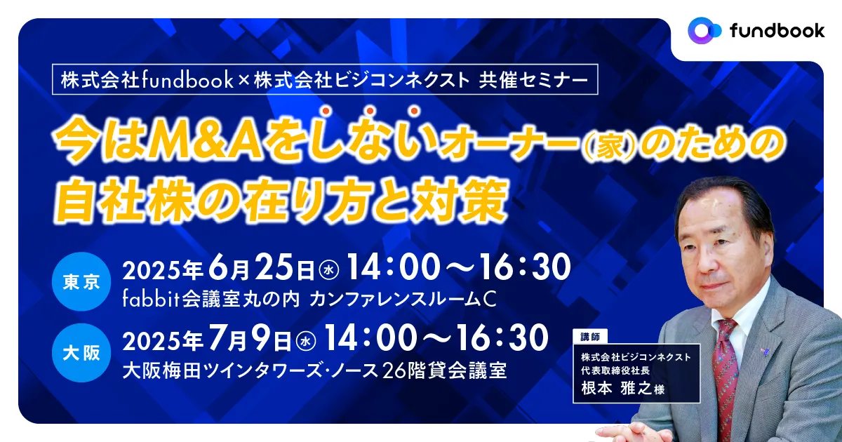 経営者やオーナーにとって、M&A(合併・買収)は一大事です。自社株にかかる問題や相続税対策は、多くの経営者にとって非常に重要な課題です。これを受けて、株式会社fundbookと株式会社ビジコンネクストが共同で、2025年6月25日(水)と7月9日(水)に東京と大阪で、経営者向けの無料セミナーを開催することが決まりました。