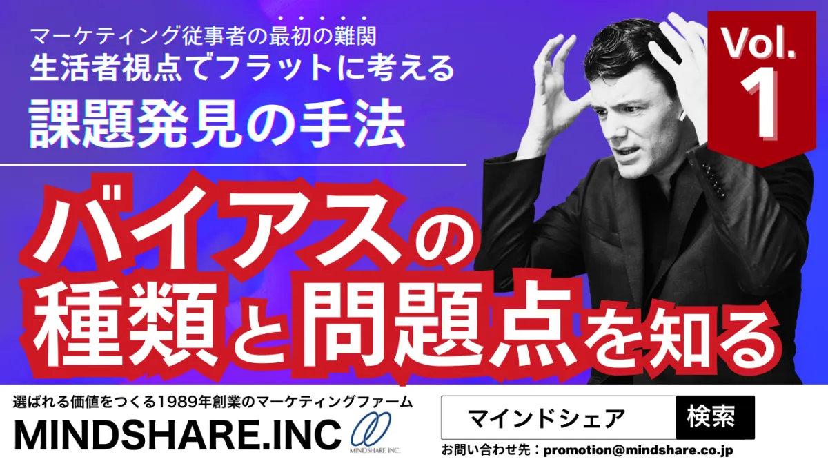 このセミナーの第一弾では、バイアスの種類とその問題点をテーマにしており、特にマーケティング従事者が陥りがちな課題について解説されています。創業38年の歴史を持つマインドシェアは、これまでに2,400社以上のマーケティング支援を行なってきた実績を持ち、さまざまな業種において成功事例をたくさん積み重ねています。