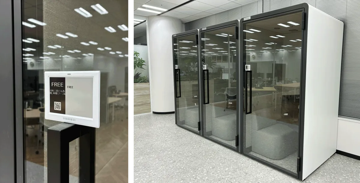 このサービスは、予約状態を色や表示で分かりやすく示し、3種類の状態を表示します。また、用途に応じて5種類のサイズが展開されるため、会議室だけでなくロッカーや物品の予約など、多様なニーズに応じて利用できます。さらに、電池駆動式ゆえに電源確保が難しい場所でも手軽に設置でき、特に省スペースのブース席でも活用可能です。