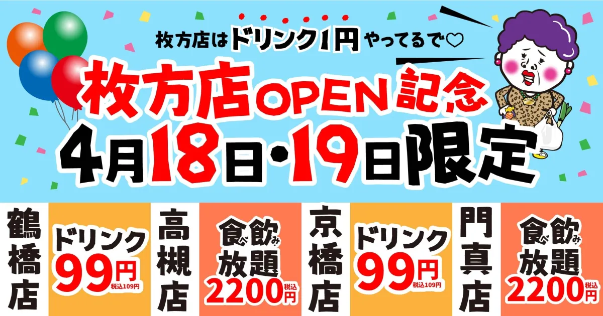 枚方店がグランドオープンを迎えるにあたり、近隣店舗である門真店、京橋店、高槻店、そして鶴橋店も一緒になって特大のキャンペーンを実施します。若者を中心に支持を集める餃子のかっちゃんが、特別価格で飲み物や料理を提供。お祝いムードの中、多くのお客さまをお迎えする準備が整っています。
