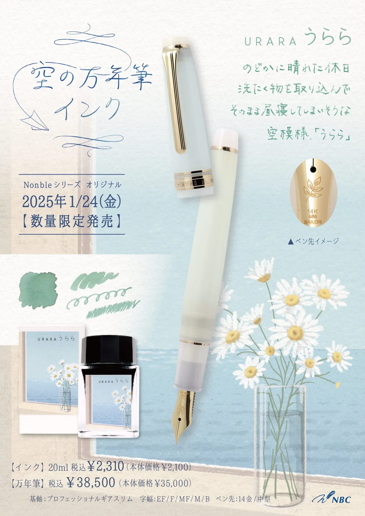 文具卸業界をリードする株式会社エヌ・ビー・シー(東京・目黒区)が、そのオリジナルブランドNONBLEから新たに数量限定商品「うらら」を1月24日(金)に発売します。この新作は、『空』というテーマにインスパイアされた万年筆とインクで、文房具ファンにとって見逃せないアイテムとなることでしょう。