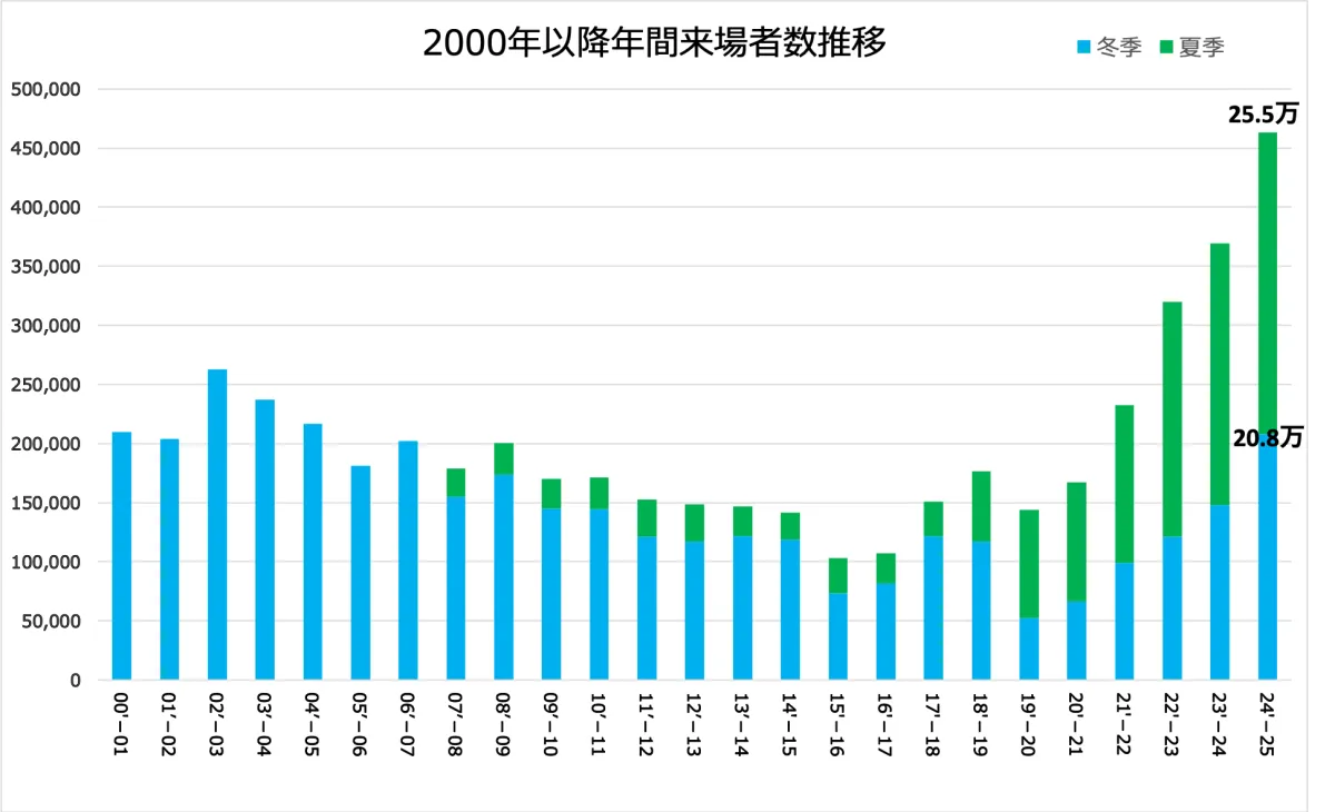 特に冬季の2024-2025シーズンにおいては、来場者数が20.8万人を超え、前年シーズン比で141%という輝かしい記録を達成しました。また、2024年度の通算来場者数は46.3万人超となり、2000年以降の年間来場者数として最高を記録した昨年度と比較しても125%の増加を示しています。