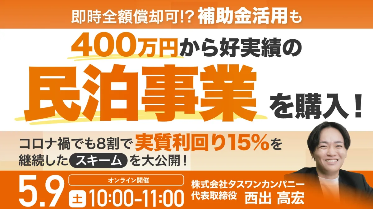 このウェビナーでは、参加費が無料で、民泊の専門家である株式会社タスワンカンパニーの代表取締役・西出高宏氏が登壇します。彼は、初期投資400万円からスタートする方法や、収益を最大化するための戦略について教えてくれます。特に、今の民泊市場での勝ち方や、成功する業者や物件の見極め方が重要なポイントです。