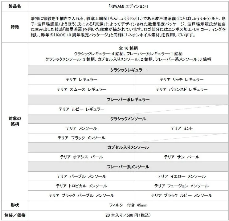 フィリップ モリス ジャパン(PMJ)は、2025年9月3日(水)から数量限定パッケージ「KIWAMIエディション」を順次発売することを発表しました。この新しいパッケージは、加熱式たばこ「IQOS ILUMA i」と専用たばこスティック「TEREA」のために特別にデザインされたもので、全16種類の銘柄を展開します。