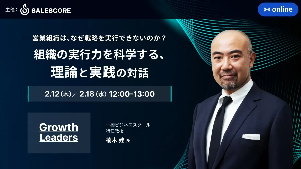 営業組織が戦略を実行できない理由には、さまざまな要因があります。SALESCORE株式会社が主催するウェビナー『Growth Leaders Vol.5』では、著名な経営学者である一橋ビジネススクール特任教授の楠木建氏が登壇し、営業戦略の実行力向上を目指します。このウェビナーでは、営業現場での実践的な学びの場を提供し、現場の状況に応じた戦略の重要性を強調します。