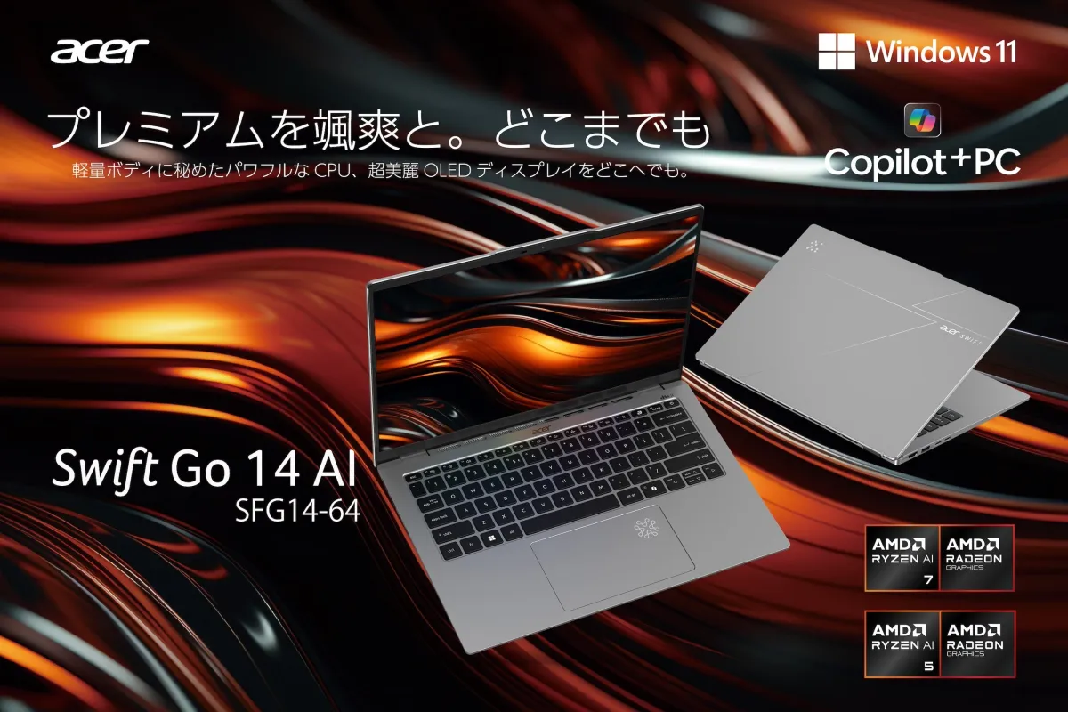日本エイサー株式会社は、2025年モデルのCopilot+PC「Swift Go 14 AI」を6月26日より順次発売しました。新たに搭載されたAMD Ryzen AI 300シリーズプロセッサーは、仕事や趣味に最適な性能を誇ります。。