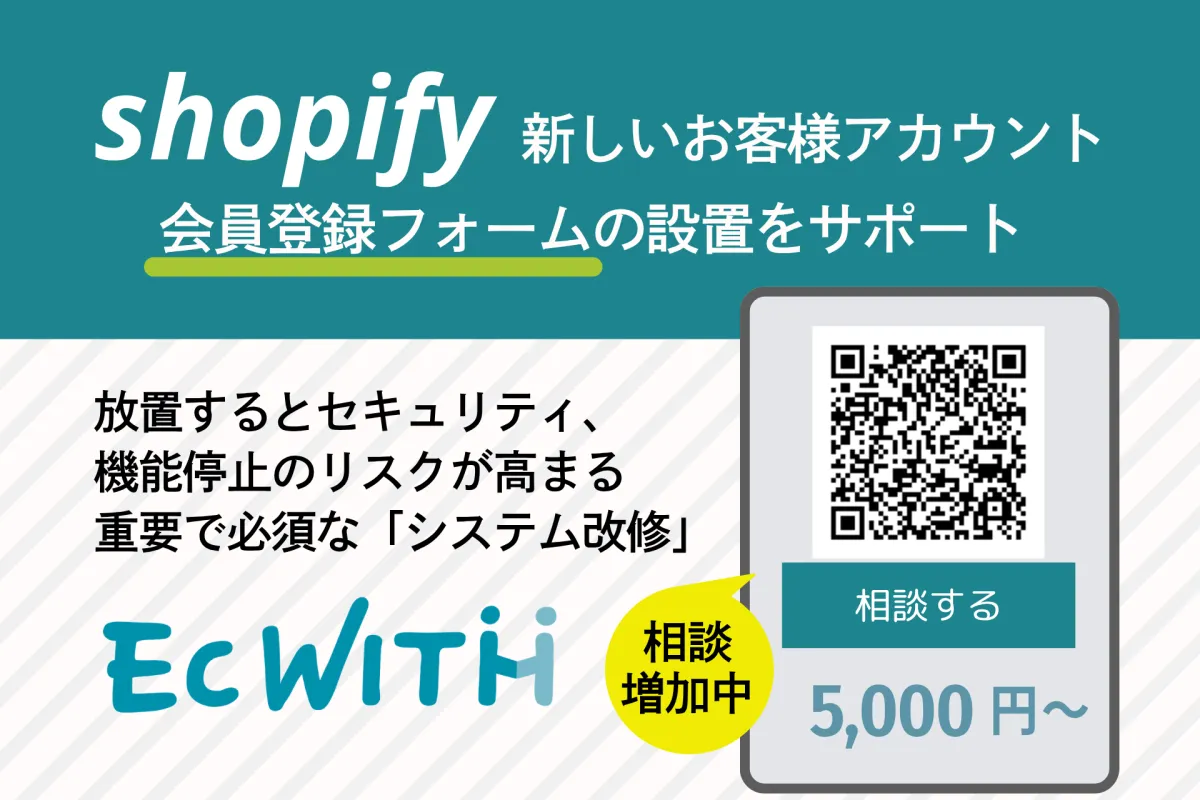 これにより、EC運営者は大きな投資を必要とせずに、最新の仕様に順応できるため、業務のリスクを大幅に減少させることが可能です。たとえば、「Shopify 新規顧客アカウント会員登録フォーム設置サービス」をはじめ、EC WITHでは多彩な支援パッケージを提供しています。最小限のコストで迅速に対応することで、EC運営者は安心してビジネスの運営に集中できるようになります。