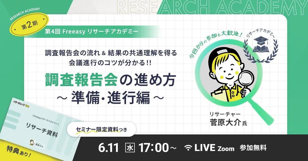 このセミナーは2025年6月11日(水)17時からの開催が予定されており、特に「調査報告会の進め方~準備・進行編~」をテーマにしています。このオンラインイベントで、参加者は調査結果を効果的に伝える方法を学ぶことができます。