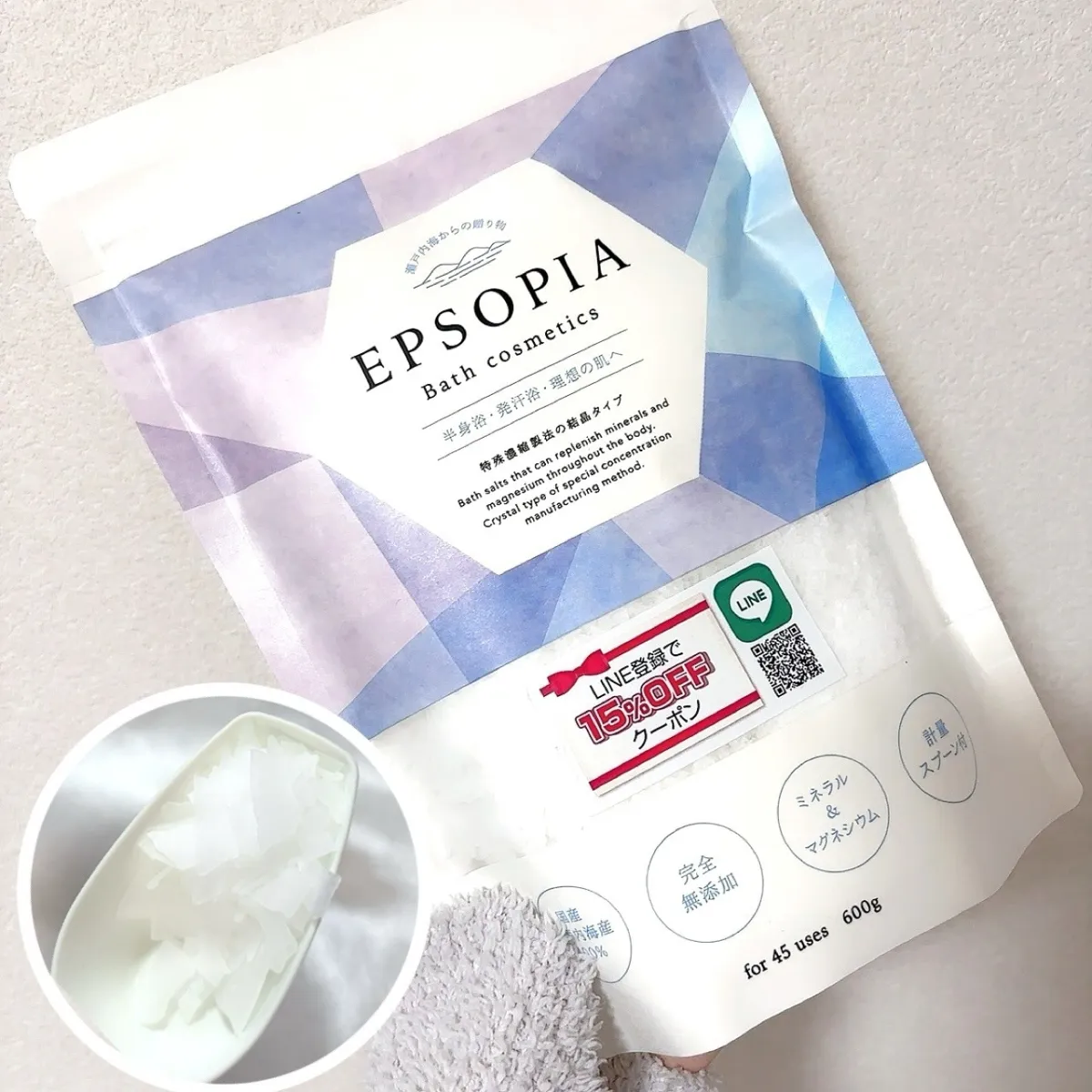 「エプソピア」とは、瀬戸内海産の100%完全無添加バスソルトです。主成分は塩化マグネシウムで、湯冷めしにくいという特性を持っています。このバスソルトは、身体を温める温浴効果が期待でき、冷え症や身体のだるさに悩む方にとって心強い味方です。また、特許製法によって塩分(ナトリウム)が99.5%以上除去されているため、風呂釜への負担も少なく、残り湯を洗濯に使用することが可能です。