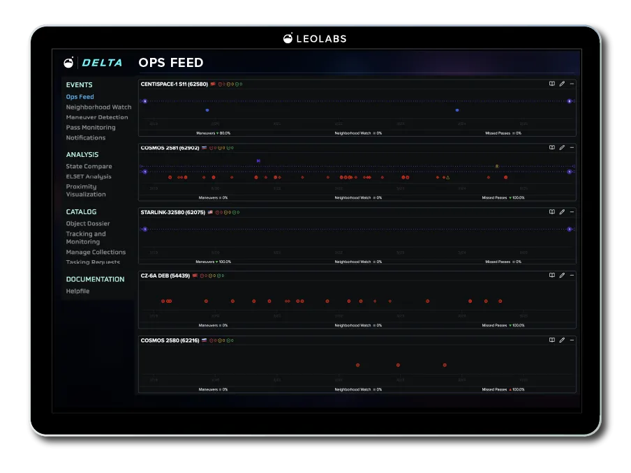 Deltaは、分散型レーダーネットワークと世界をリードする商用低軌道物体カタログの両方を活用することで、必要な情報を収集し、リアルタイムでの脅威監視を可能とします。また、特定のミッションに関連する物体を常に監視し、異常の検知や活動パターンの解析を行い、得られた知見を運用者に迅速に伝えます。