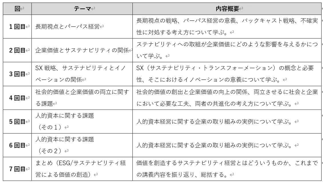 - - カリキュラム内容:全7回の講義では、ESGおよびサステナビリティに関する基礎から応用までを学びます。受講生は企業経営におけるサステナビリティへの取組を、長期的な視点で捉え、企業価値向上のための具体的な戦略を考慮する力を養います。