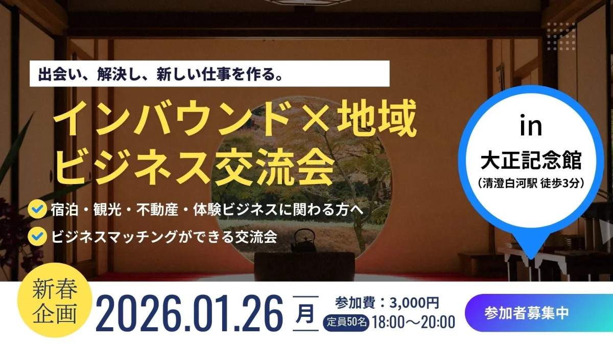 2026年の観光業界に向けた新たな取り組みとして、民泊とインバウンドビジネスの促進を目的にしたイベントが開催されます。1月24日(土)には「リゾート民泊講座」が、1月26日(月)には「インバウンドビジネス交流会」が行われ、観光庁の支援を受けた内容が展開されます。