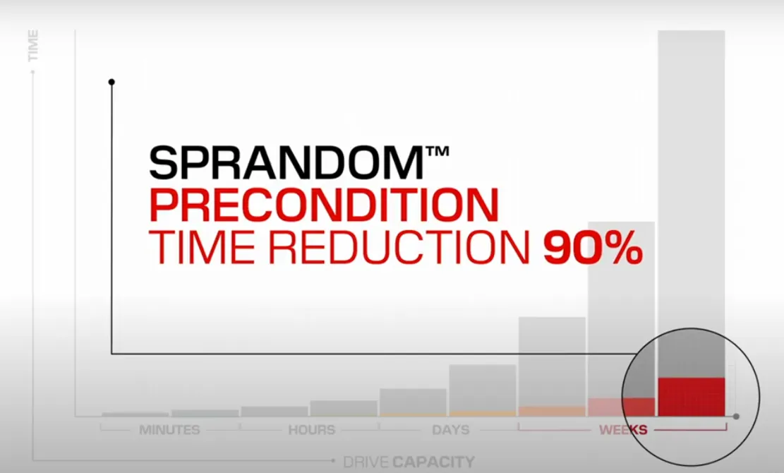 プリコンディショニングとは、SSDを実際に使用する環境に近い条件で試験することで、より正確で再現性のあるパフォーマンスデータを得るためのプロセスです。これまでは、16TB以上のSSDの定常状態での試験に数日から数週間もの時間がかかっていましたが、サンディスクのSprandomによってこのプロセスが大幅に短縮されることが期待されています。