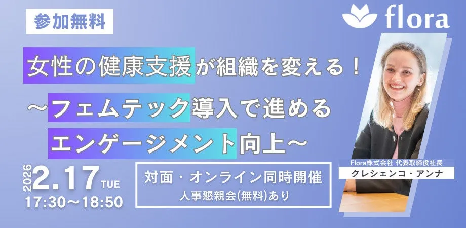 Flora株式会社が主催するウェビナー「女性の健康支援が組織を変える!〜フェムテック導入で進めるエンゲージメント向上〜」が、2026年2月17日(火)17:30から18:50まで開催されます。このセミナーは、企業の人事担当者やダイバーシティ推進に関わる方々を対象としたもので、対面とオンラインのハイブリッド形式で行われます。