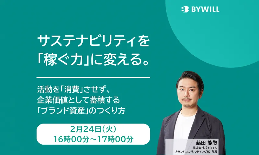そこで、株式会社バイウィルは、2026年2月24日(火)に「サステナビリティを『稼ぐ力』に変える。活動を『消費』させず、企業価値として蓄積する『ブランド資産』のつくり方」というテーマで無料のオンラインセミナーを開催します。このセミナーでは、企業が抱えるサステナビリティの課題を解消すべく、戦略を解説していきます。