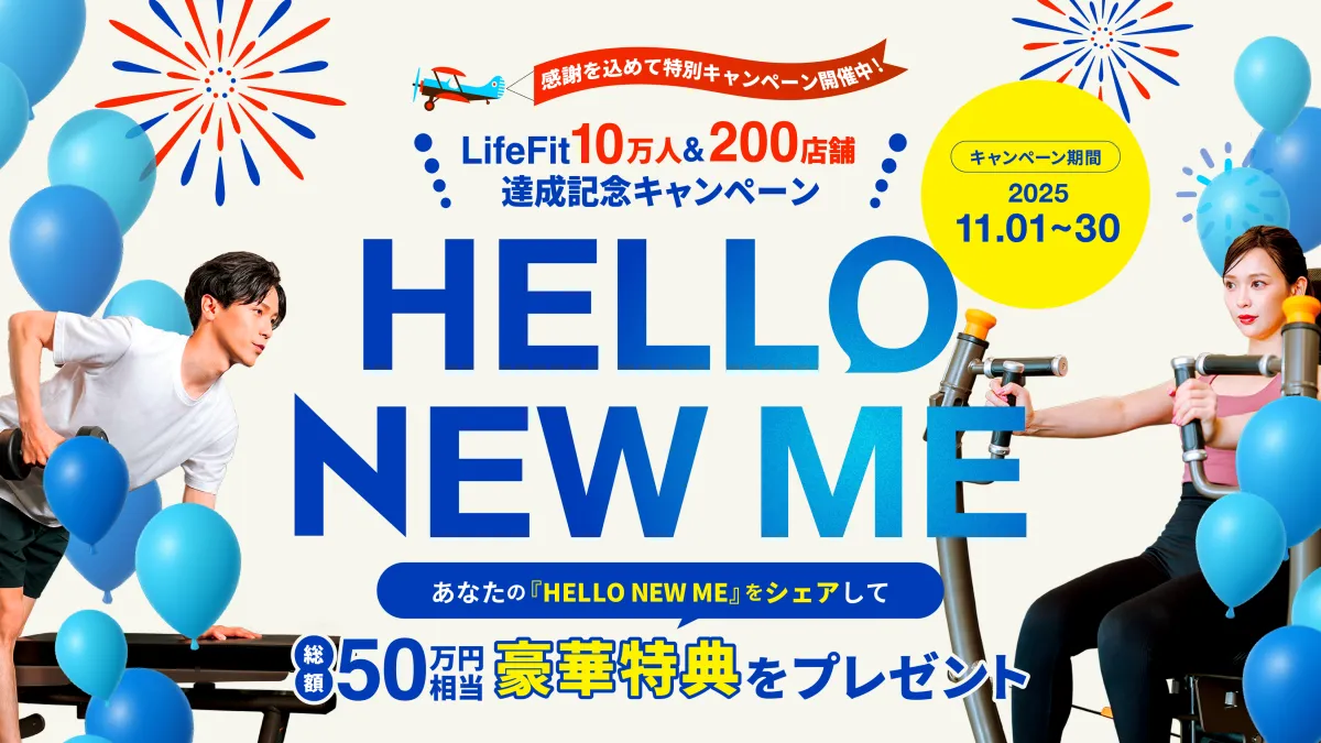 フィットネス業界に新風を巻き起こしている「LifeFit」は、2025年11月1日より、「LifeFit10万人&200店舗達成記念キャンペーン-HELLO NEW ME-」を開催します。このキャンペーンは、アクティブユーザー数が10万人を超え、全国の店舗数が200を突破したことを祝うものです。