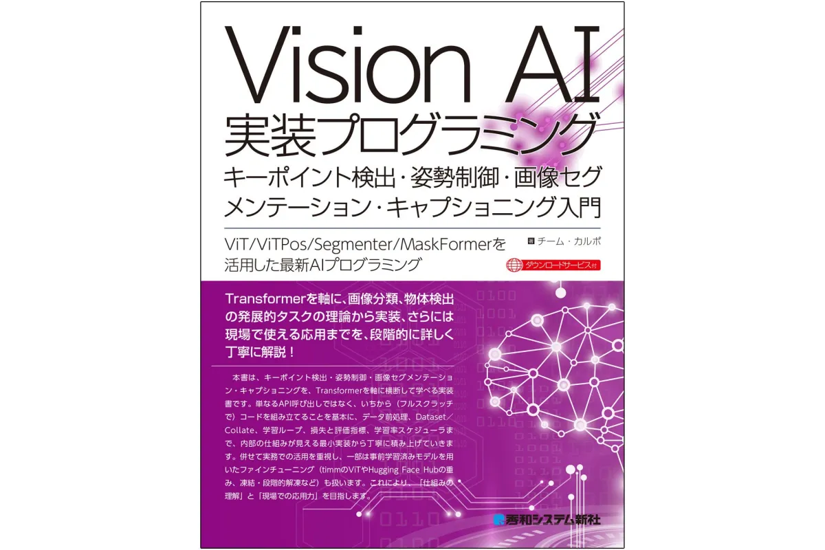 株式会社秀和システムが、2026年1月26日に新刊『Vision AI実装プログラミング キーポイント検出・姿勢制御・画像セグメンテーション・キャプショニング入門』を発売します。この書籍では、近年急速に発展しているTransformerベースの画像認識手法について詳細に解説し、実践的な知識を提供します。