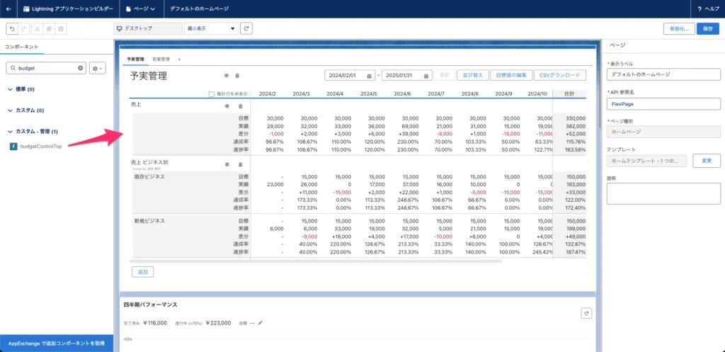 Lightningページ上にコンポーネントとして追加することができ、ホーム画面から直接「Easy Budget」を利用できます。これにより、アクセスのしやすさが向上します。
