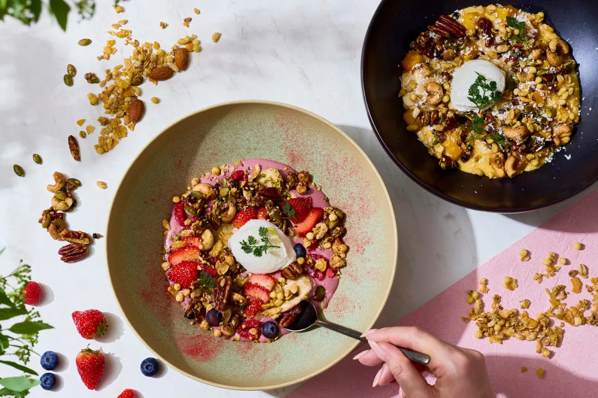 このボウルにはスーパーフードのアサイーと、ビタミンたっぷりのいちご、エネルギー源となるバナナが混ぜられています。砂糖不使用のクリーミーベースが魅力で、トッピングには自家製グラノーラや新鮮なフルーツが使用されています。