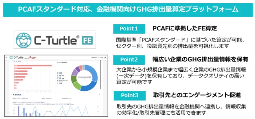 「C-Turtle® FE」は、調達先の削減努力を自社のScope3排出量の削減に取り込むことができる新たなGHG排出量可視化ソリューションです。このサービスは、金融機関が国際的に採用されている排出算定基準、いわゆる「PCAFスタンダード」に基づいており、投融資先のファイナンスド・エミッションの可視化や削減を支援します。これにより、金融機関は自身の環境への影響を正確に把握し、効果的な対策を講じることが可能になります。