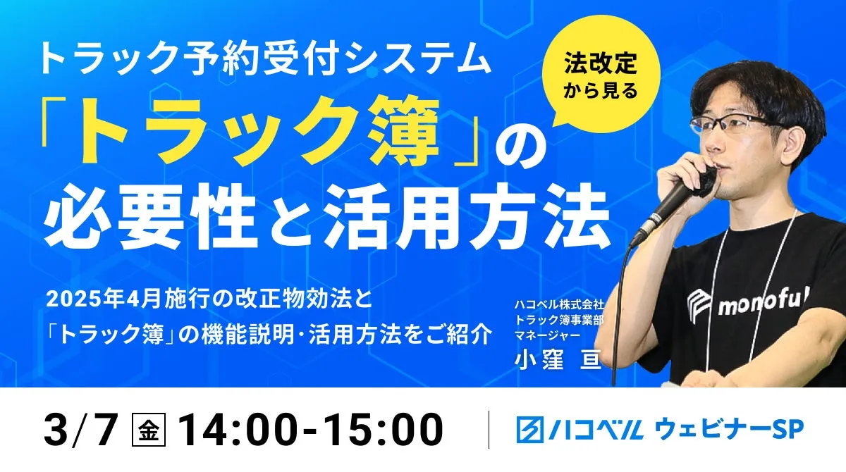 物流プラットフォームを提供するハコベル株式会社は、2025年3月7日(金)にトラック予約受付システム「トラック簿」に関するウェビナーを開催します。このウェビナーでは、近年の改正物流効率化法に基づき、荷待ち荷役時間の計測と削減の重要性について詳しく解説します。