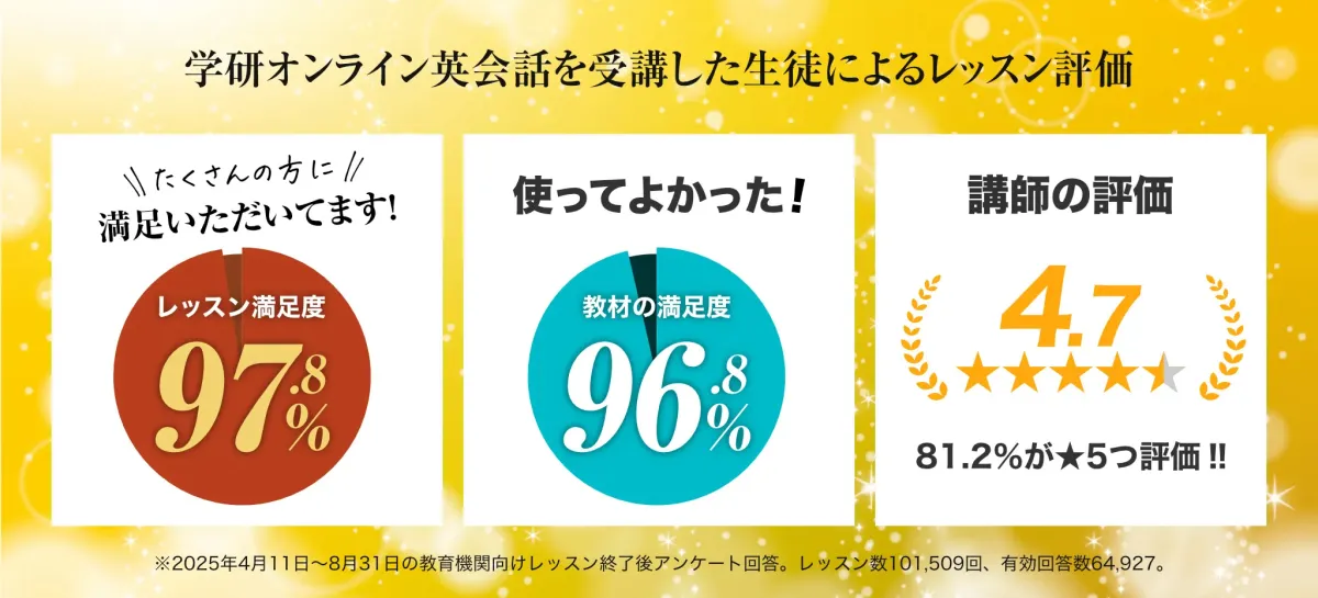 調査は、78校以上の教育機関で使用され、64,927件の有効回答が集まりました。アンケートは受講後に提示されるもので、レッスンの進行、講師とのやり取り、教材の質など、多岐にわたる項目について評価されました。特筆すべきは、レッスン満足度が97.8%という数字で、質の高い英会話教育が成立していることが証明されています。