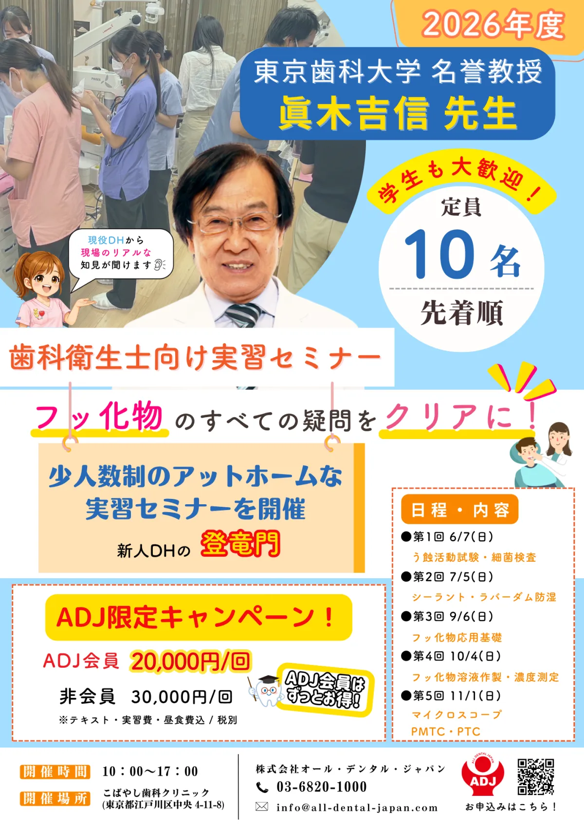 株式会社オール・デンタル・ジャパンは、歯科衛生士の臨床スキルや医院全体の予防レベルを向上させることを目的に、東京都江戸川区で「予防歯科・フッ化物実習セミナー」を開催します。このセミナーは、東京歯科大学名誉教授の眞木吉信先生を講師に迎え、フッ化物の基礎知識から臨床への応用までを分かりやすく解説します。