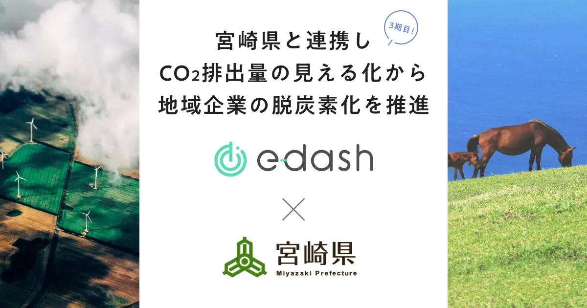 2021年3月、宮崎県は「2050年ゼロカーボン社会」の実現を目標に掲げました。この目標達成へ向けた重要な一手として、宮崎県内の企業を対象にした脱炭素経営の支援が本格化しています。その中心となるのが、e-dash株式会社(東京都港区)が提供するCO2排出量可視化・削減サービスプラットフォーム「e-dash」です。3年連続で宮崎県から業務を受託し、今後も70社程度の企業に対して具体的な支援を行うことが決定しました。