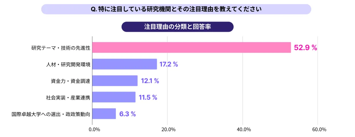 わずかに52.9%の研究者が「研究テーマ・技術の先進性」を選定理由として挙げ、最多の評価基準となりました。続いて「人材・研究開発環境」が17.2%、「資金力・資金調達」が12.1%と続き、これらの要素が選定の大きな要因であることが示されています。
